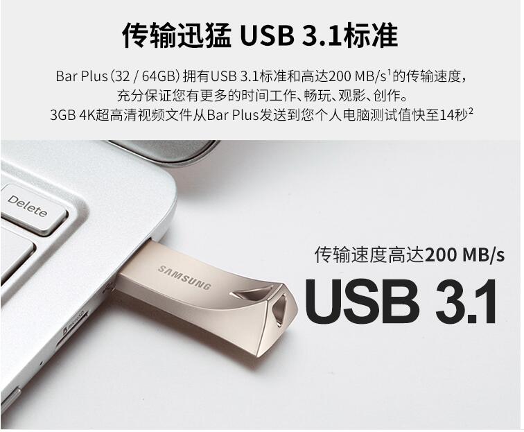 三星優(yōu)盤64GB USB3.1 U盤 BAR升級版+高速汽車載歌曲金屬外殼精致